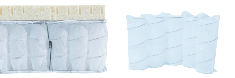 The production process begins with automatic pocket spring coiling machines, where the springs are individually formed and encased in non-woven spunbond fabric, preventing friction and allowing each spring to move independently. The pocket springs are then aligned into continuous rows and assembled into custom mattress sizes using precision pocket spring assembly machines.